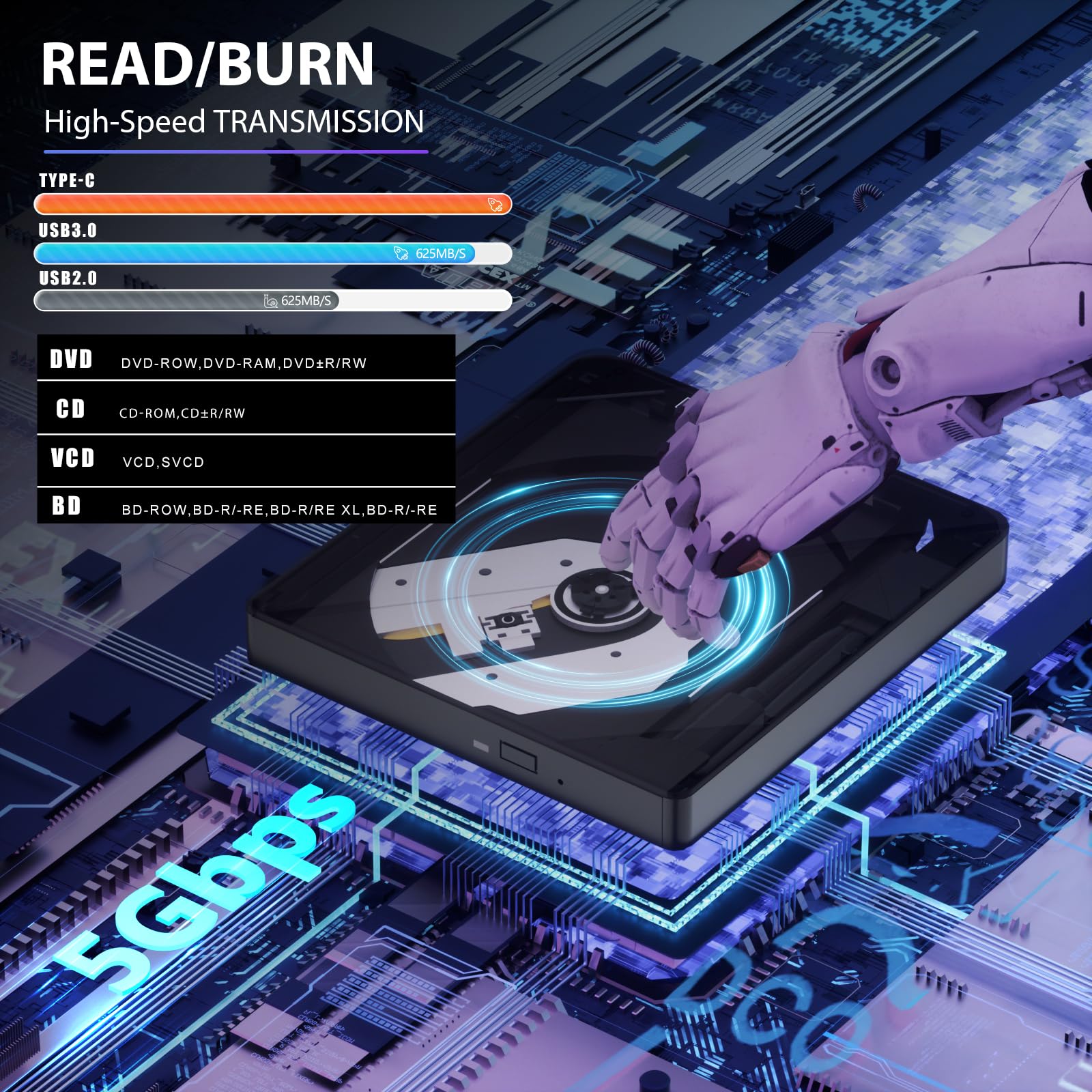 PLUG AND PLAY: This 7 in 1 multifunctional external BD/cd/dvd drive is easy to use and requires no external drivers. It can be powered by a single USB cable, and its body features an eject button for convenient disc loading. Simply press the eject button and insert the disc, then plug the external Blu-ray burner into your computer's USB interface.