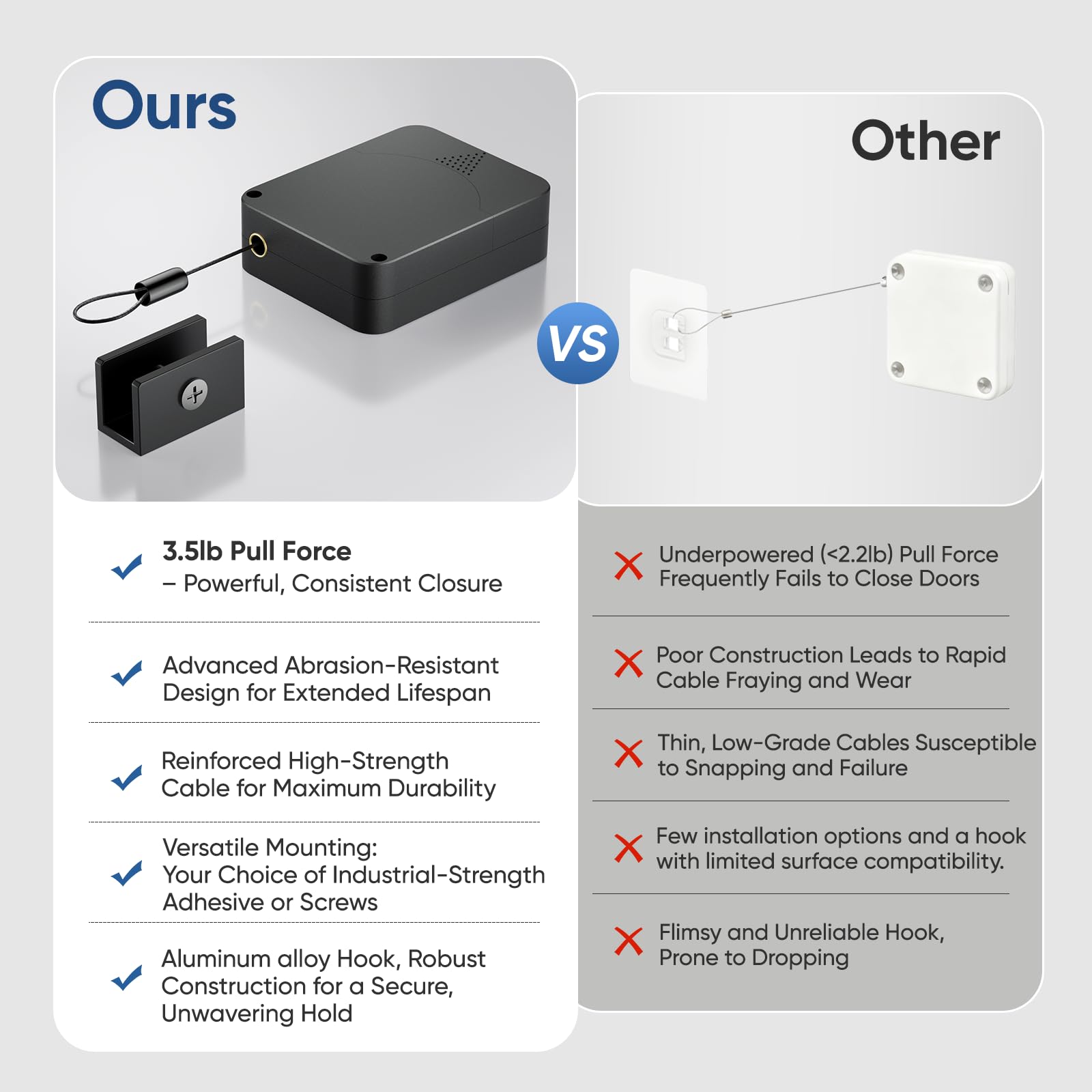【Built to Last: S304 Stainless Steel Cable】Features a multi-strand S304 stainless steel cable with a clear anti-rust coating, engineered to resist wear through thousands of retractions. Far more resilient than basic wire-based closers.